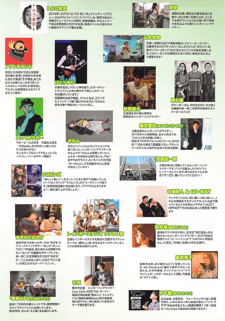 arbor on the ridgeway/Beginning Of Sunday/ICHIROO/io(Retro Page)/KEIJI/Kohei Okutani/SHINO/SHO & YUMI/SIN/THE CABE$/アラ還-Kids/ウッド森川/キシモトジュンイチ/ごま/ささきたかし/さとうこうすけ/ときわ/とどすずき/トルコ東京/ノブトキケント/びとうゆり/ふっくんラガー/ホルム/マコピンズ/ゆきちとおしげ/レインボースタジオ ウクレレ部/右京/宇治達也/季節*FU/咲弥/山本克彦/勝ち猫/中嶋幹人&GO-WAY/松原雄太/扇芝智也/池原匡一郎/奴亦准/畠奈津子/木下徹/木下悠介/TAS☆TAP/宝塚東高校フォークソング部